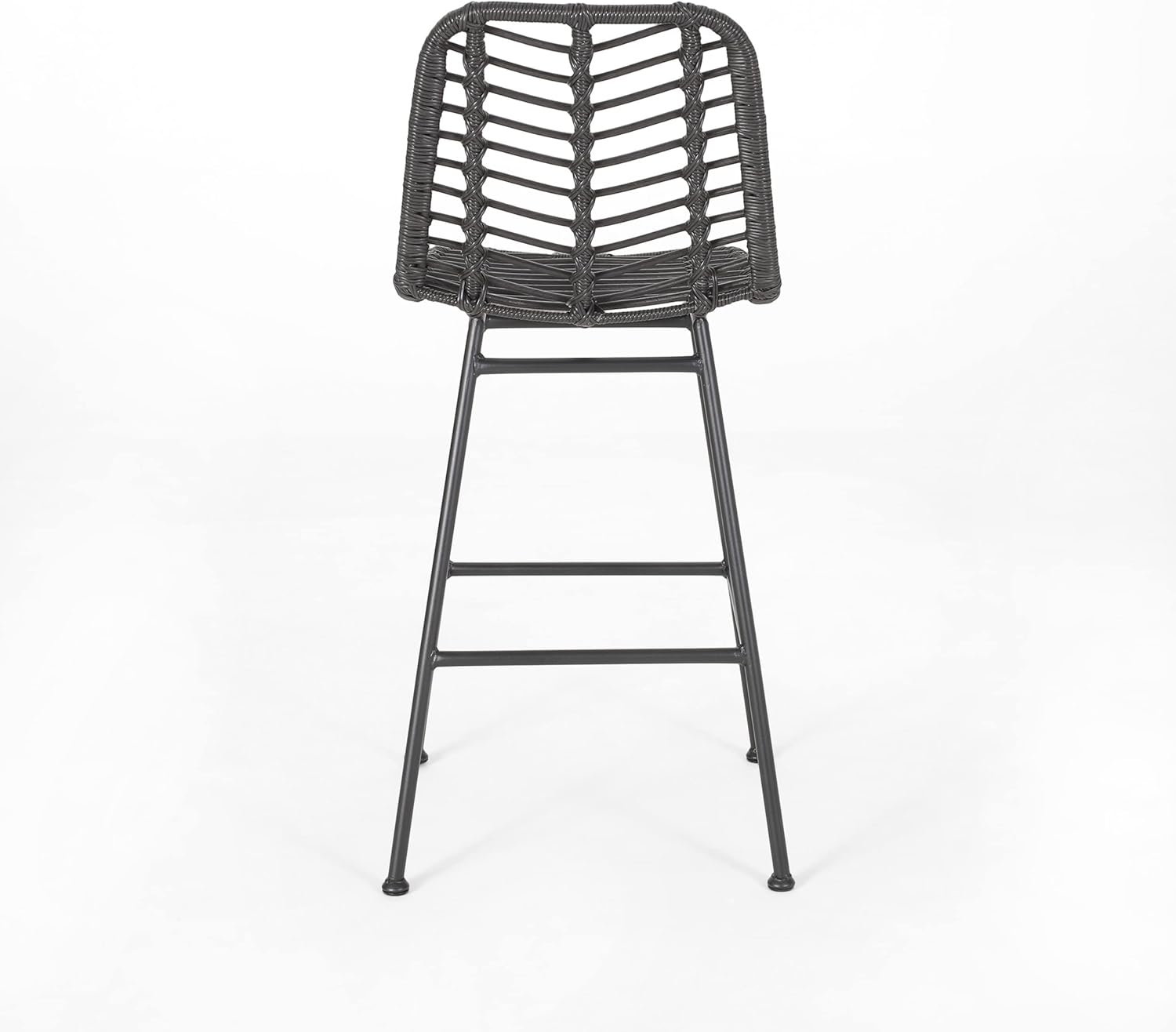 Add a touch of exquisite taste to your backyard bar with our refined yet outstanding bar stool set. Crafted to superior excellence, these bar stools perfectly blend rattan and metal to bring your outdoor space together with a flourish. The wrapped rattan design brings a modern twist to a classic look, making this ideal for any style of decor. With a thin angled frame, this bar stool set also provides a minimalistic yet durable structure that offers a stylish flair to your space.Material: Faux RattanFrame Material: IronMultiple Finish OptionsFrame Finish: BlackAssembly RequiredDimensions: 21.75 inches deep x 20.25 inches wide x 43.00 inches highSeat Dimensions: 16.00 inches deep x 16.50 inches wide x 28.75 inches highFootrail Height: 11.75 inches