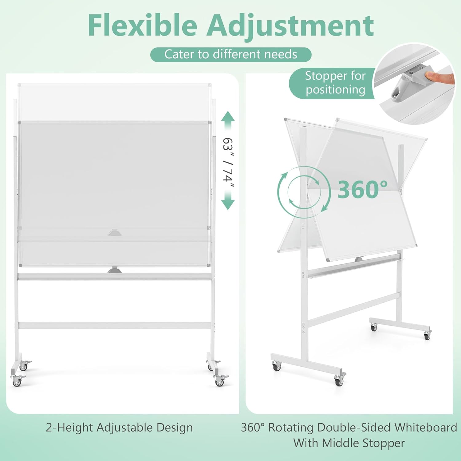 Description:Discover the ultimate tool for creative and efficient presentations—the 360° rotating double-sided whiteboard! Effortlessly switch between sides and lock it at an upright position for the best perspective. This spacious 48" x 36" board is not only magnetic and stain-resistant but also comes fully equipped with a treasure trove of accessories: 6 markers, 12 magnets, a flipchart, and more! Whether heightening it to 74" for adults or lowering to 63" for kids, this adaptable piece with flexible adjustment moves seamlessly on silent, floor-friendly lockable casters. Ideal for classrooms bustling with ideas, boardroom strategies, or a spontaneous drawing session at home. Its well-crafted details and robust metal stand ensure longevity. Ready to elevate your brainstorming sessions? Make this versatile workspace essential all yours!Features:2-height adjustable design can cater to different needs360° rotating feature with middle stopper for smoothly transitioning between sides48" x 36" large writing surface for teaching, brain storming or presentationMagnetic surface for smooth writing and easy cleaningComes with 12 magnets, 6 markers, a dry eraser, a flipchart pad and 2 flipchart clipsBuilt-in marker tray for convenient storagePremium aluminum frame with thoughtful corner protectors for a long lifeLockable universal casters ensure easy mobility and stable placementVersatile use suitable for various scenarios, such as your home, office or schoolAssembly neededSpecifications:Color: White/White + Sage GreenMaterial: Honeycomb Panel + Metal + Aluminum + ABS + PUOverall Dimensions: 50" x 21.5" x 63"/74";126 x 54 x 160 cm/188 cm (L x W x H)Dimensions of Whiteboard: 48" x 36"/120 x 90 cm (L x W)Net Weight: 31 lbs/14 kg1 x Double-Sided Whiteboard1 x Eraser1 x Flipchart Pad 2 x Clips6 x Markers12 x Magnets1 x User Manual