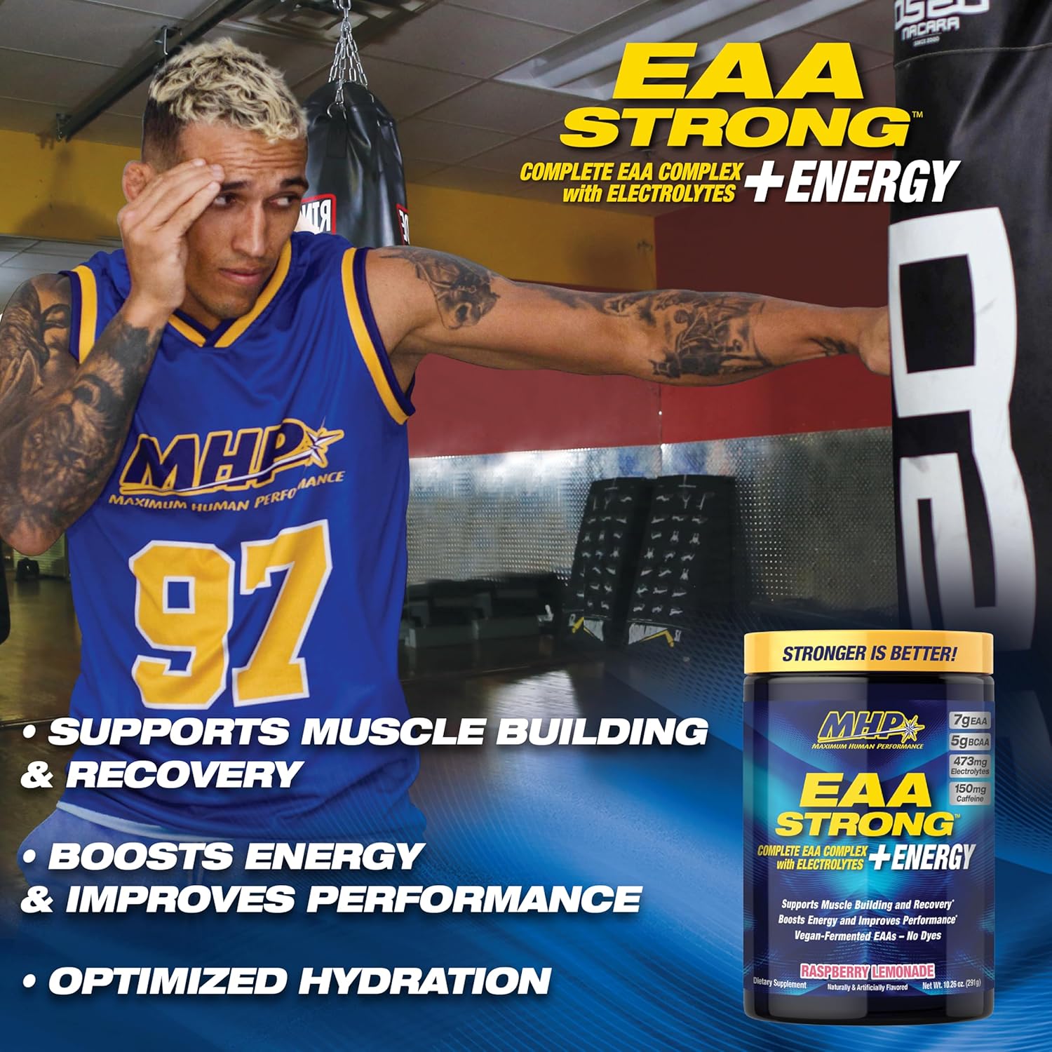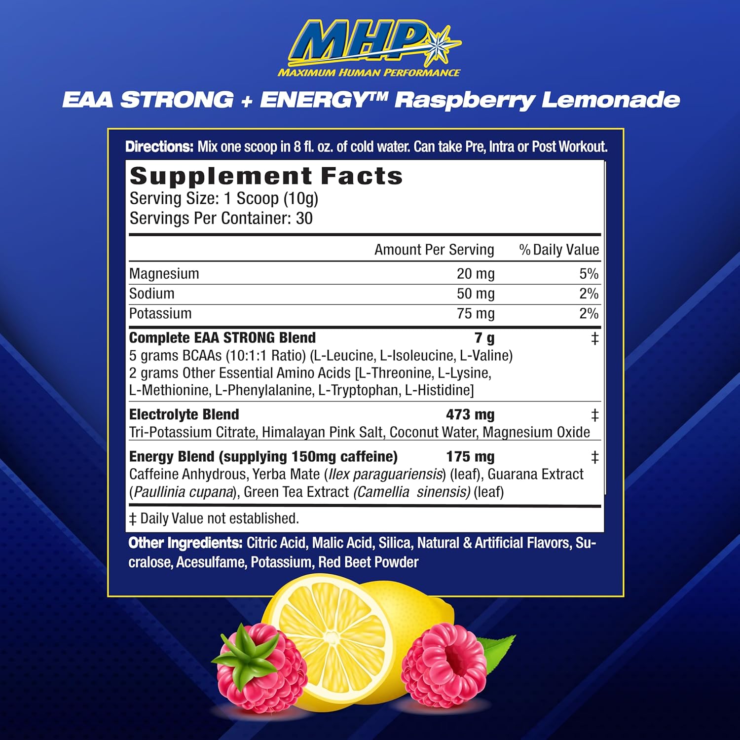 ENERGIZING ESSENTIAL AMINO ACID SUPPLEMENT: MHP’s EAA STRONG + ENERGY amino acid powder provides 7 grams of all nine essential amino acids, including 5g BCAA. These essential amino acids support muscle building and recovery and guard against muscle breakdown during training.* Plus, it provides natural energizers and electrolytes
