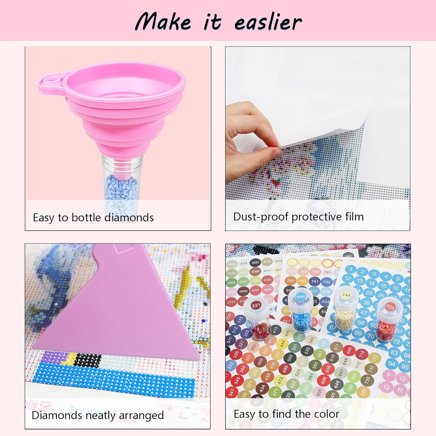 | Included Components | diamond tray, tweezers, 4 pens, non-slip mat, non-stick release papers, 60 bottles, 4 labeled stickers, 1 blank sticker, 2 finger protective covers, sealable bags, zippered bag, glue clay, correction tool, foldable funnel |